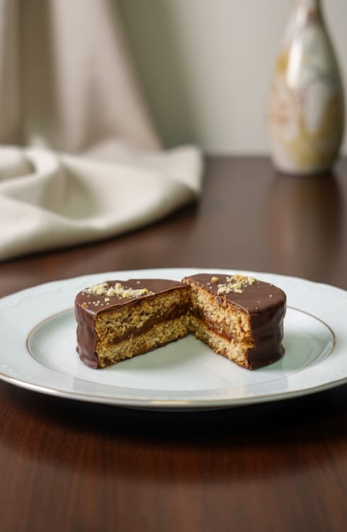 Alfajor vegano y libre de azúcar refinada elaborado de harina de almendras y avena relleno de crema de maní con dátiles